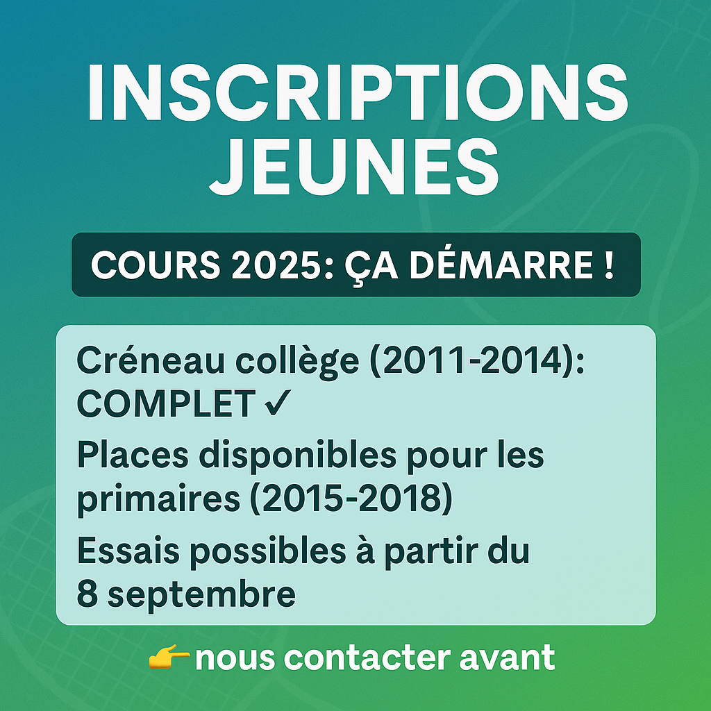 La saison reprend et les demandes affluent pour nos cours jeunes ! Découvrez les créneaux encore disponibles pour vos enfants et toutes les infos pour venir faire un essai dès la rentrée. 🏸